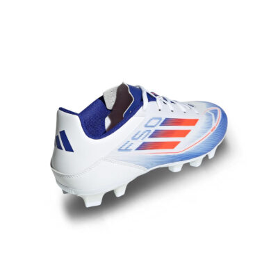 • La suela de la bota adidas F50 CLUB FxG distribuye los tacos triangulares en formación 8+4 para aporta equilibrio y favorecer la tracción en acciones de agilidad y rapidez sobre campos de fútbol de hierba natural húmeda o seca.