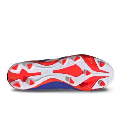 La suela FxG incorpora una placa polivalente de tacos triangulares y una distribución 8+4, proporcionando un agarre y equilibrio óptimos en una variedad de terrenos, tanto en hierba natural seca como en césped artificial.
